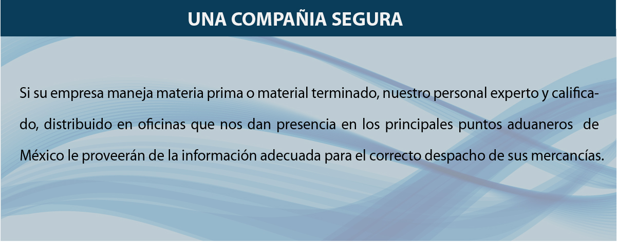 Nuestra empresa cuenta con presencia en los principales puntos aduaneros de México, donde se le provee de toda la información necesaria para el despacho de sus mercancías; así como con el personal calificado para controlar y supervisar el cumplimiento de las diferentes etapas de sus operaciones lo cual deriva en rapidez y eficiencia.